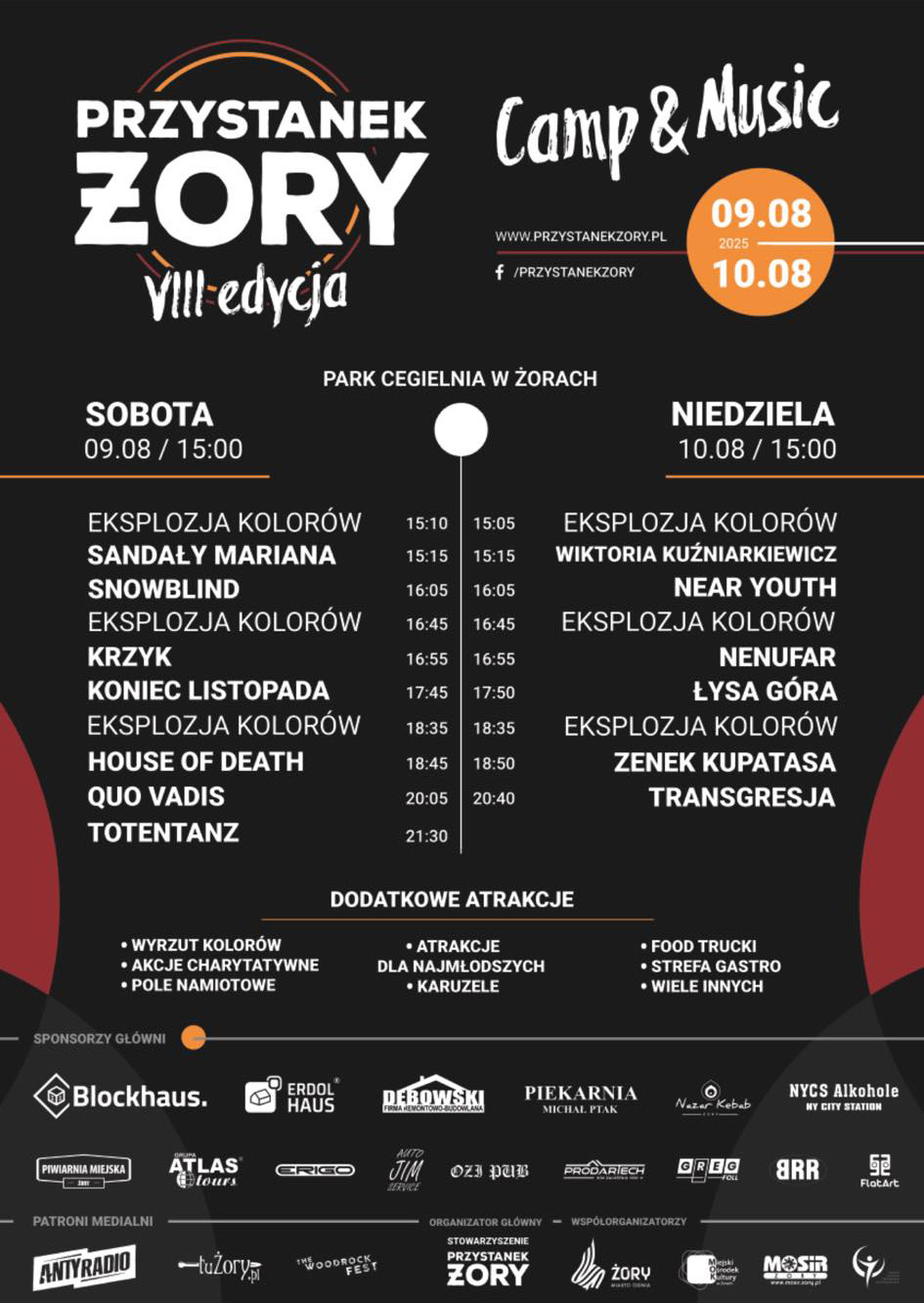 W sobotę 9 sierpnia od godziny 15:00 czekają na uczestników koncerty zespołów takich jak Snowblind, Krzyk, Koniec Listopada, House of Death, Quo Vadis czy Totentanz. Zwieńczeniem wieczoru będzie energetyczny after „w Twojej głowie”. W niedzielę 10 sierpnia wystąpią m.in. Wiktoria Kuźniarkiewicz, Near Youth, Nenufar, Łysa Góra, Zenek Kupatasa i Transgresja, a wszystko zakończy się wielkim finałem z przytupem.